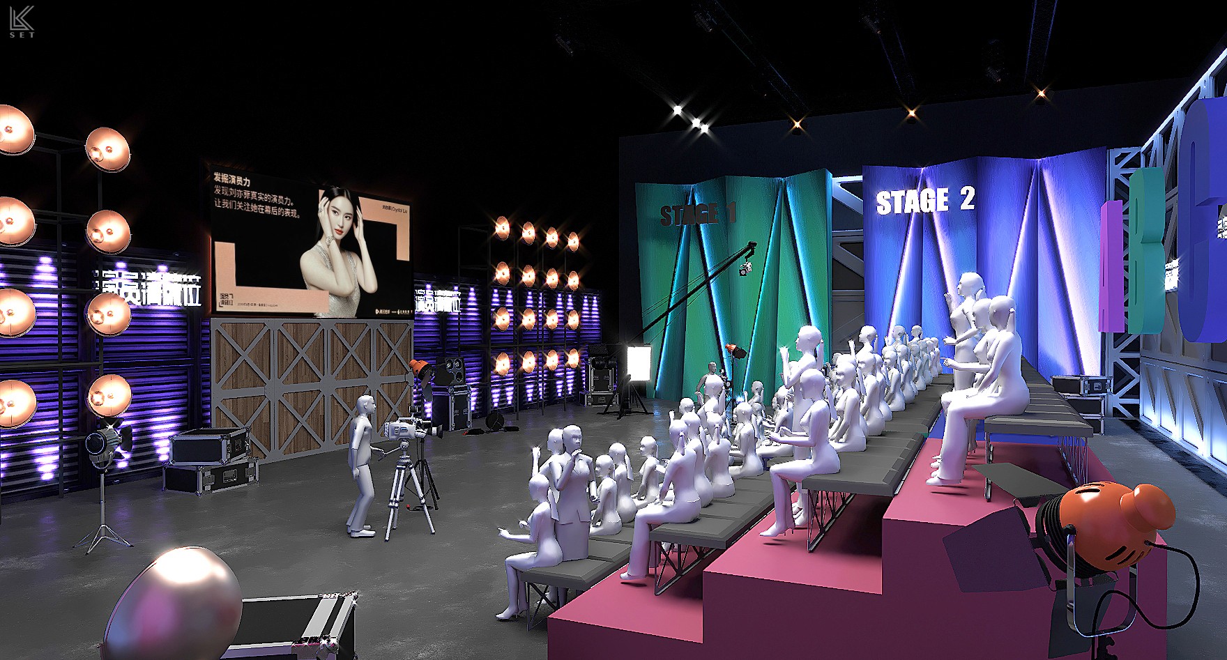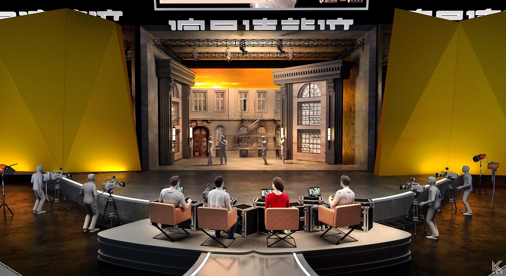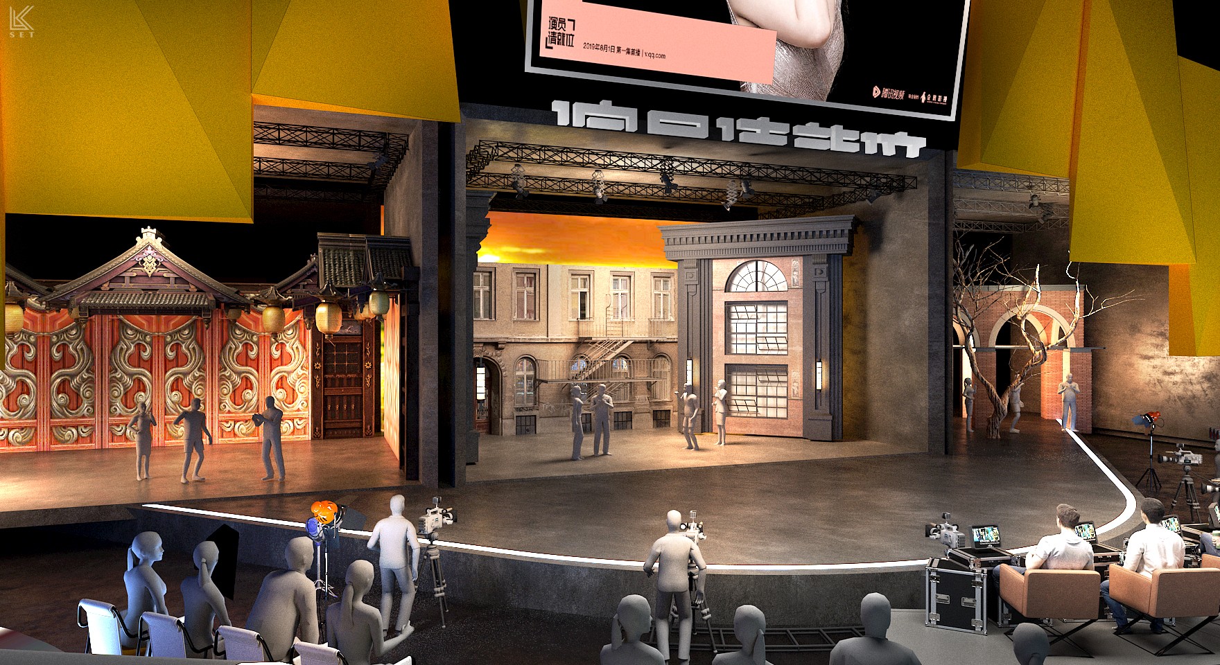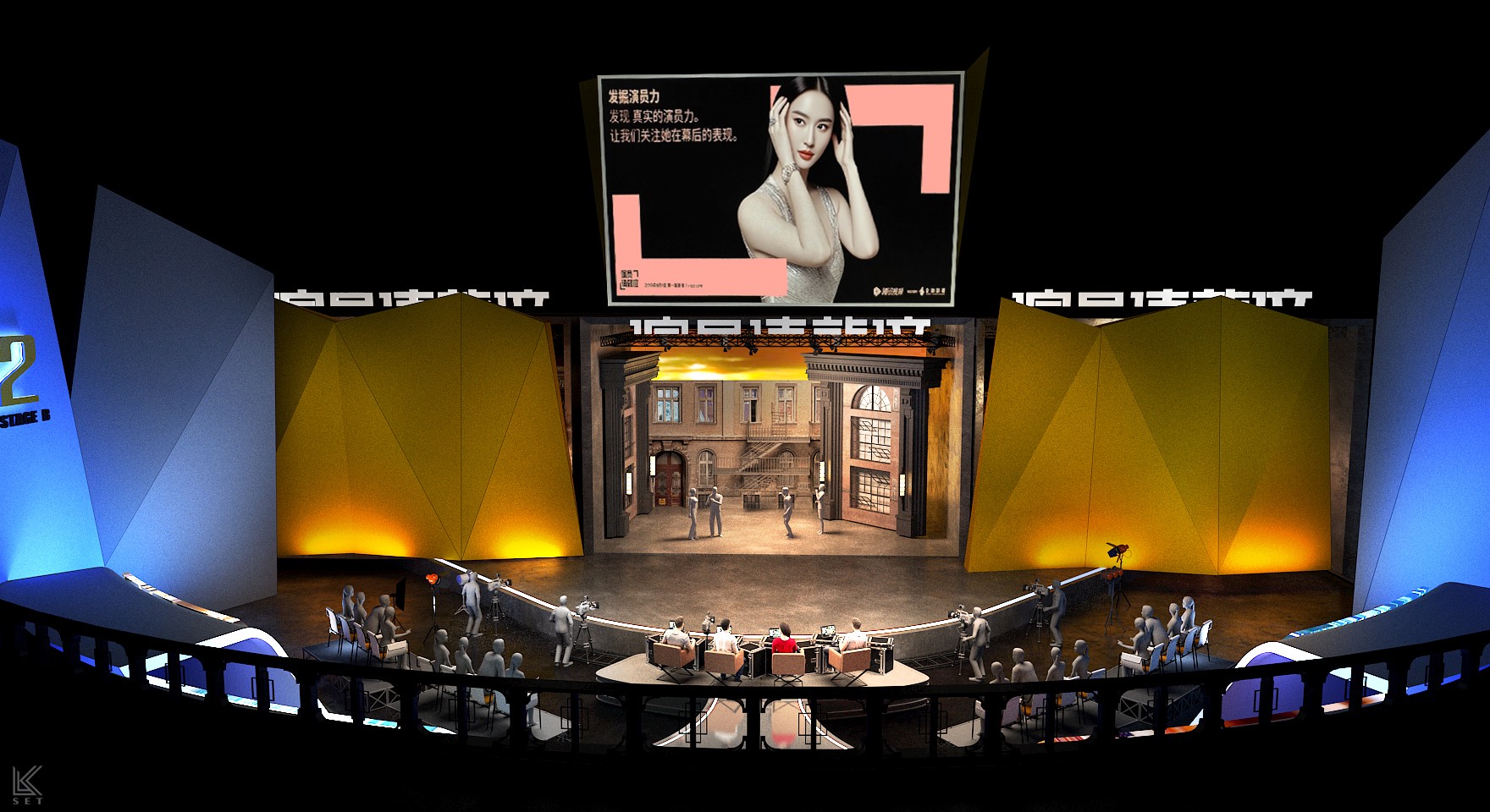 The core of 'Actors, Please Take Your Place' Season 1 was not just about performance itself, but a complete simulation of the filmmaking process. My design concept was to create a "meta-space"—a hybrid environment merging a real film shoot, live competition, and backstage observation. We built a highly modular scenic system, with several pre-prepared, film-quality sets on mobile platforms. These were managed by a backstage track system akin to a circular conveyor belt, ensuring that complex scenes could be swapped with precision in a very short time. It was this industrial-grade efficiency in scene changes, combined with hyper-realism, that elicited the most authentic performances from the actors. Ultimately, this design became a powerful catalyst: every viral "famous scene" on social media and every intense debate among the directors on performance standards originated within this brutal yet authentic theatrical world I constructed.