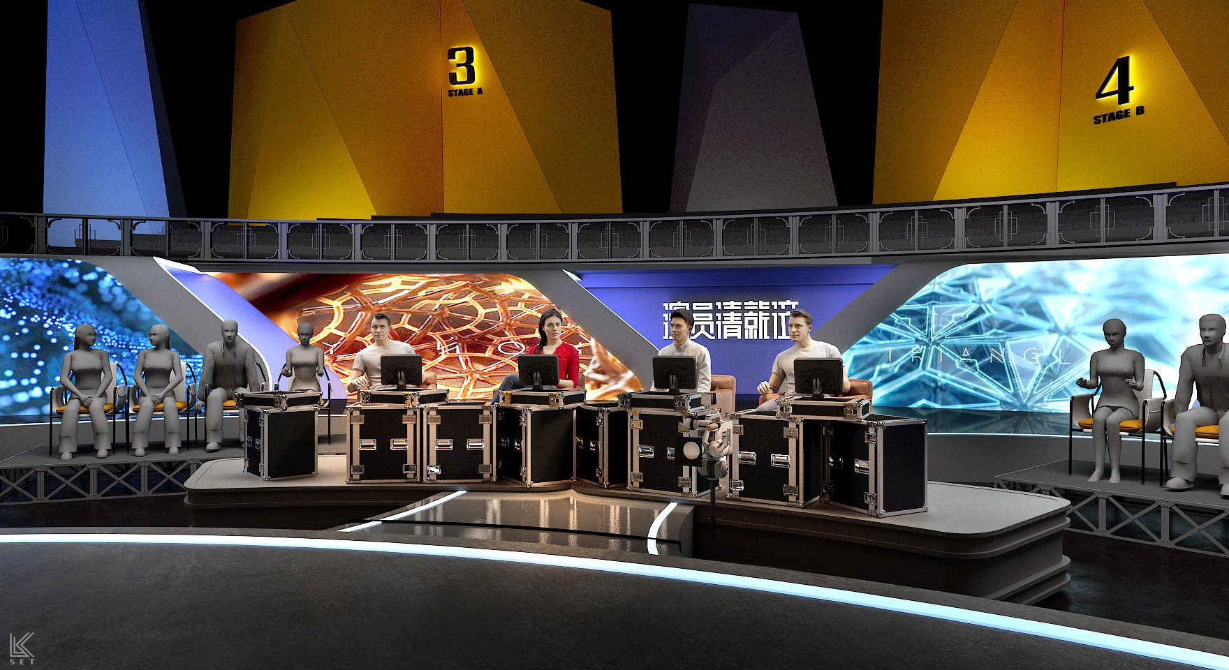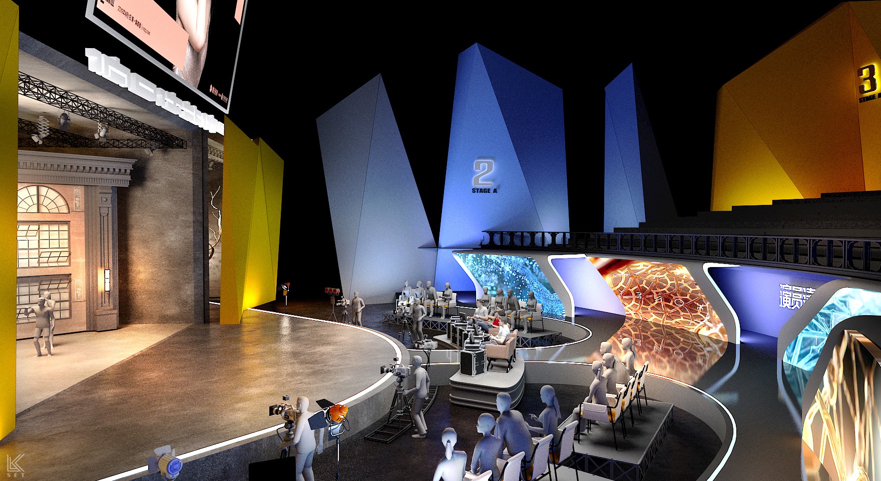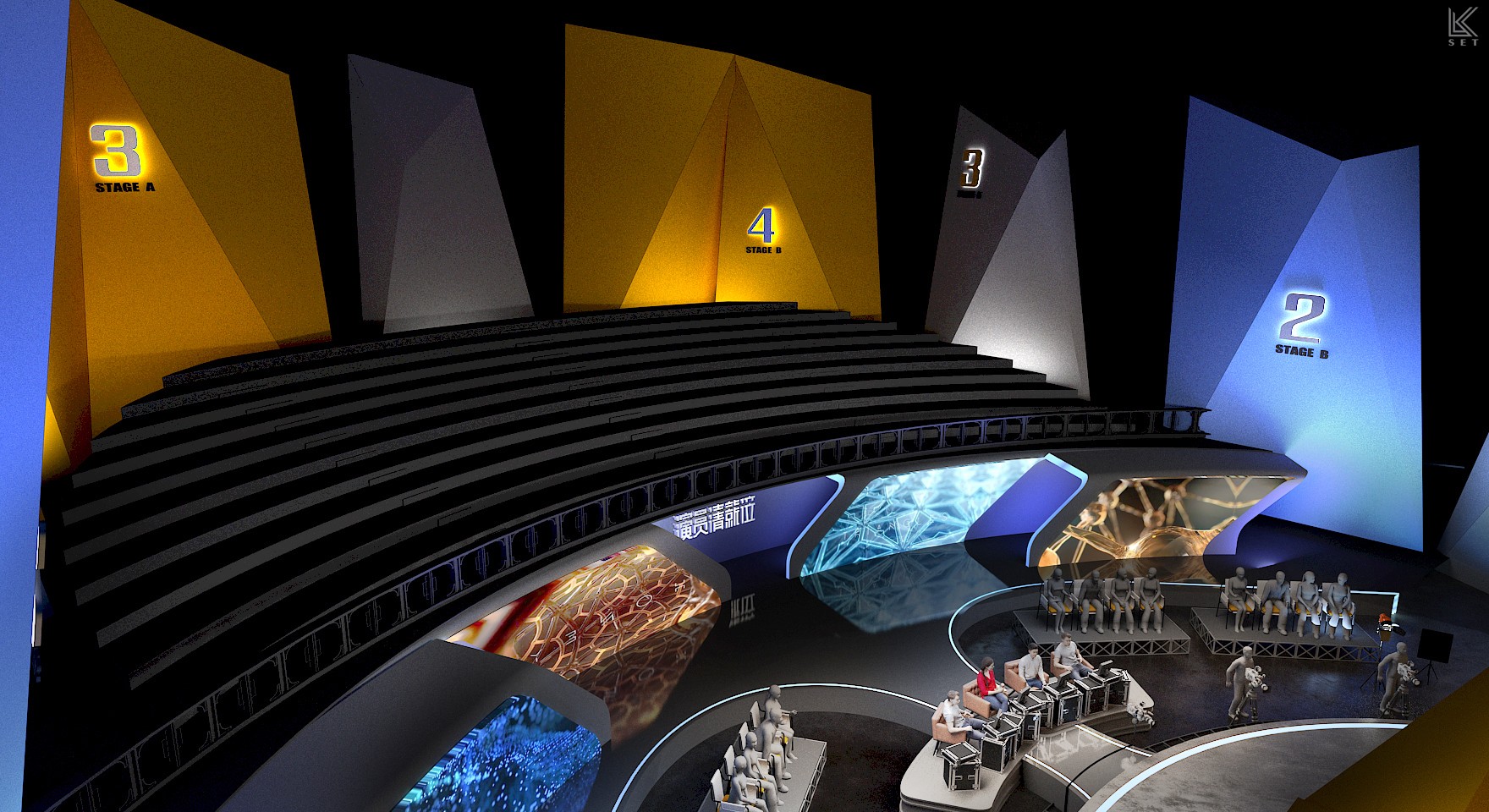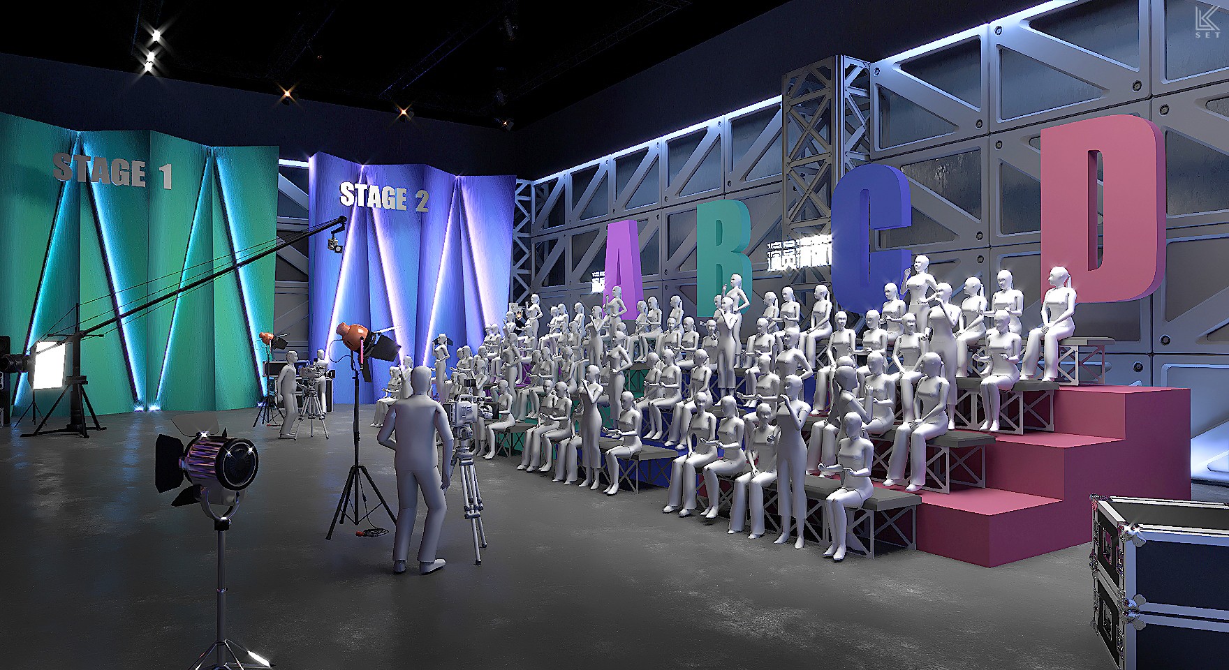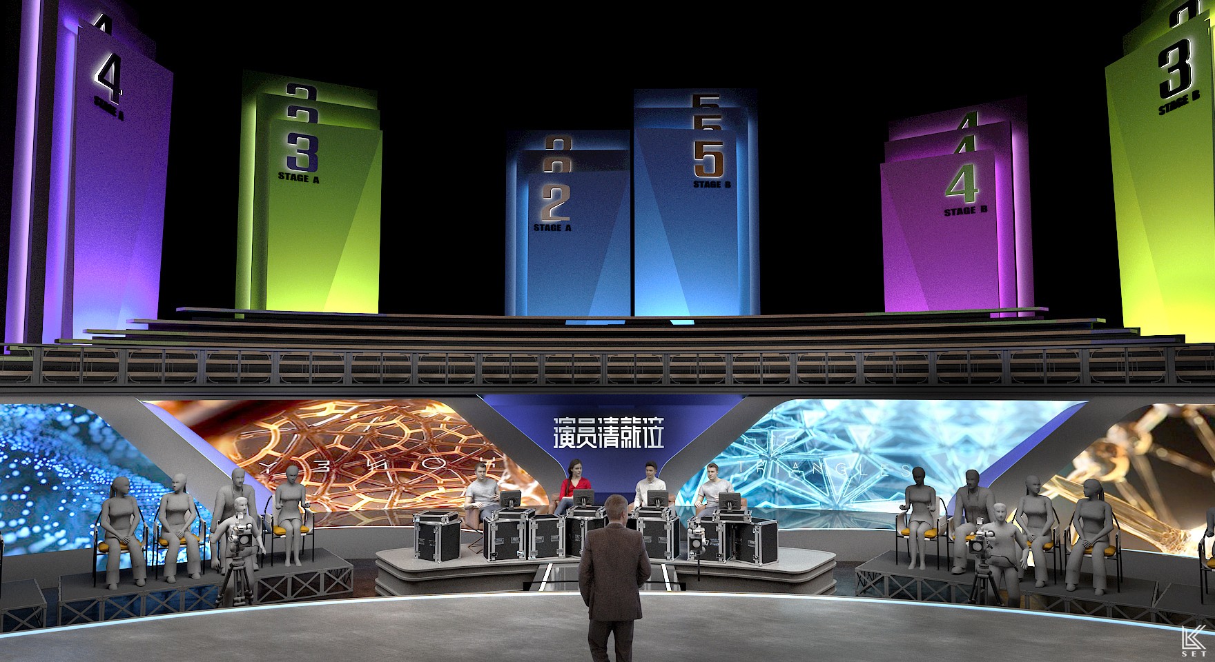 The core of 'Actors, Please Take Your Place' Season 1 was not just about performance itself, but a complete simulation of the filmmaking process. My design concept was to create a "meta-space"—a hybrid environment merging a real film shoot, live competition, and backstage observation. We built a highly modular scenic system, with several pre-prepared, film-quality sets on mobile platforms. These were managed by a backstage track system akin to a circular conveyor belt, ensuring that complex scenes could be swapped with precision in a very short time. It was this industrial-grade efficiency in scene changes, combined with hyper-realism, that elicited the most authentic performances from the actors. Ultimately, this design became a powerful catalyst: every viral "famous scene" on social media and every intense debate among the directors on performance standards originated within this brutal yet authentic theatrical world I constructed.