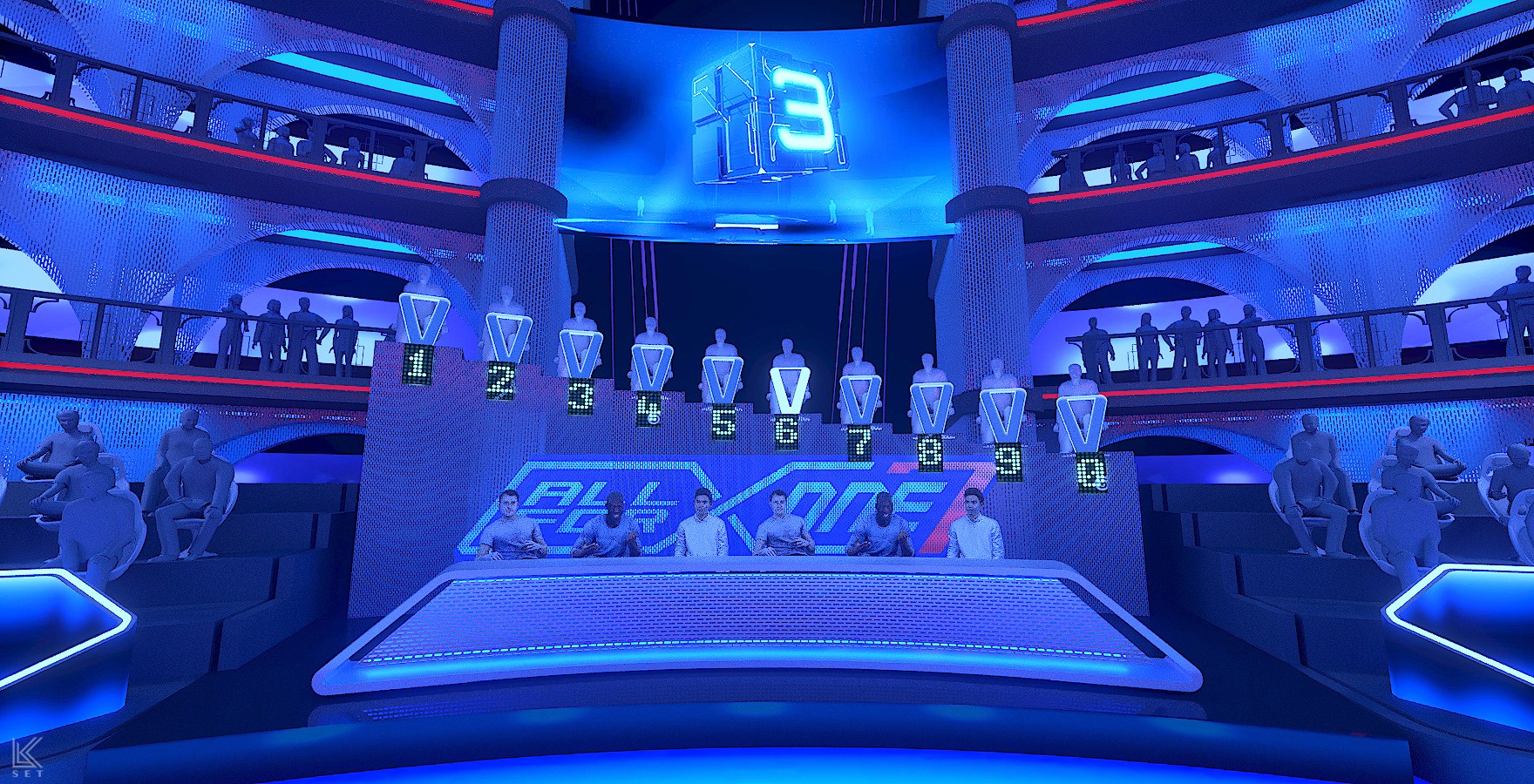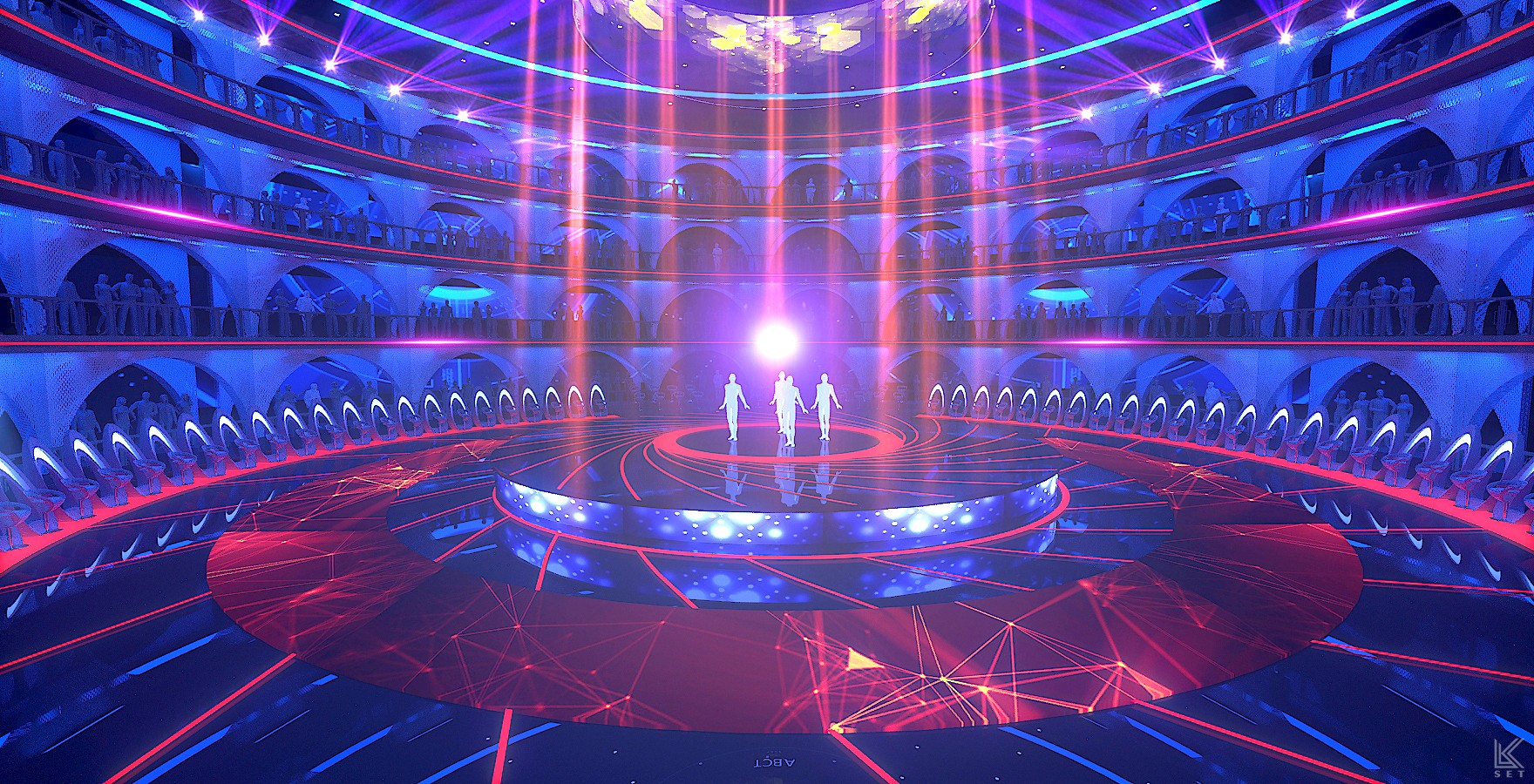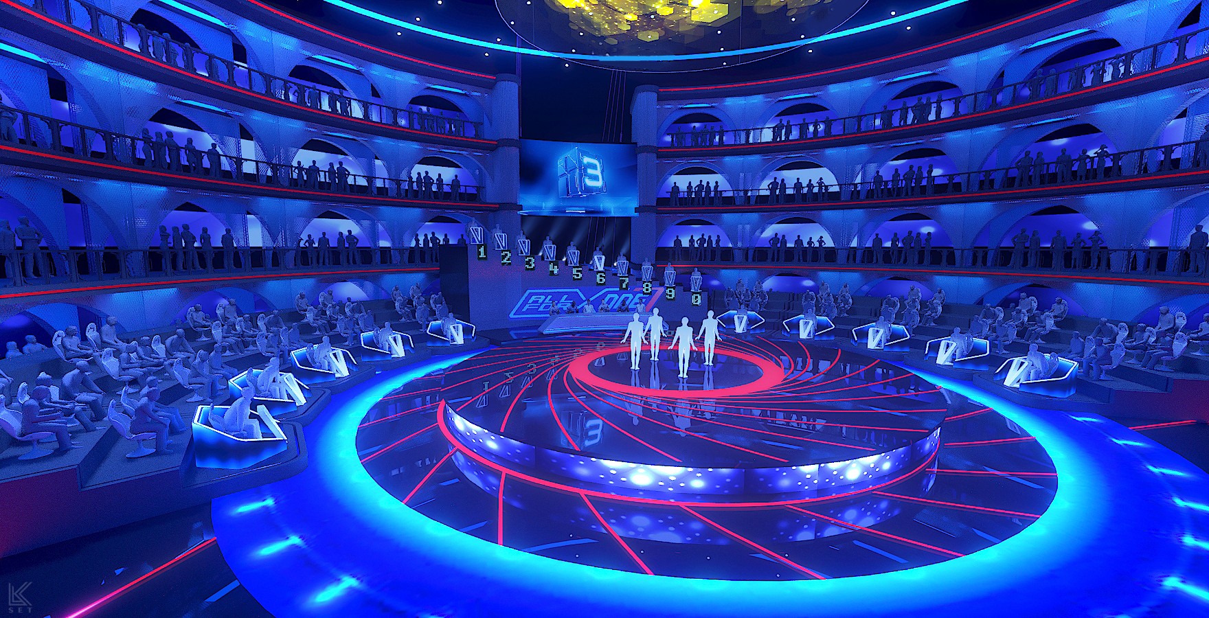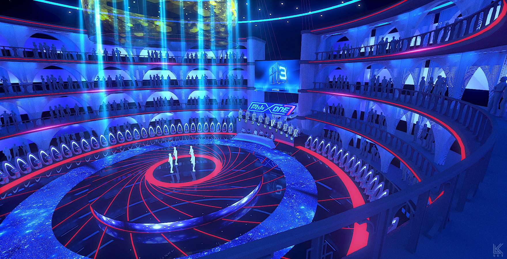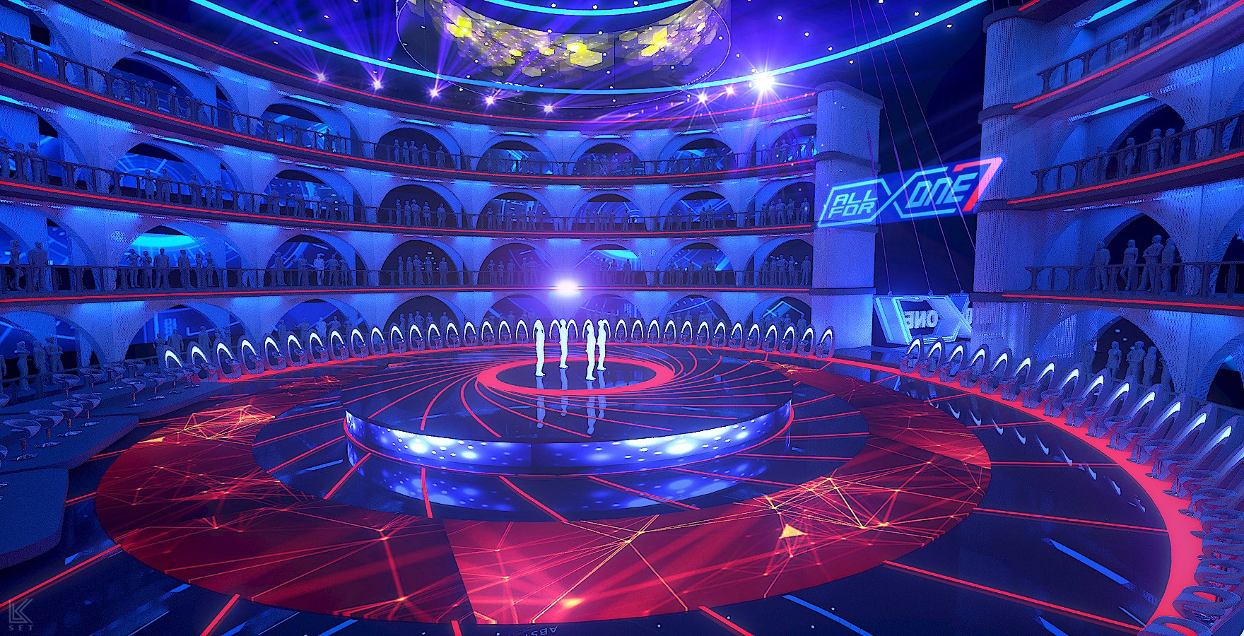 Inspired by a modern coliseum, this stage blends geometric structure with light and motion to create a powerful space for group competition.
