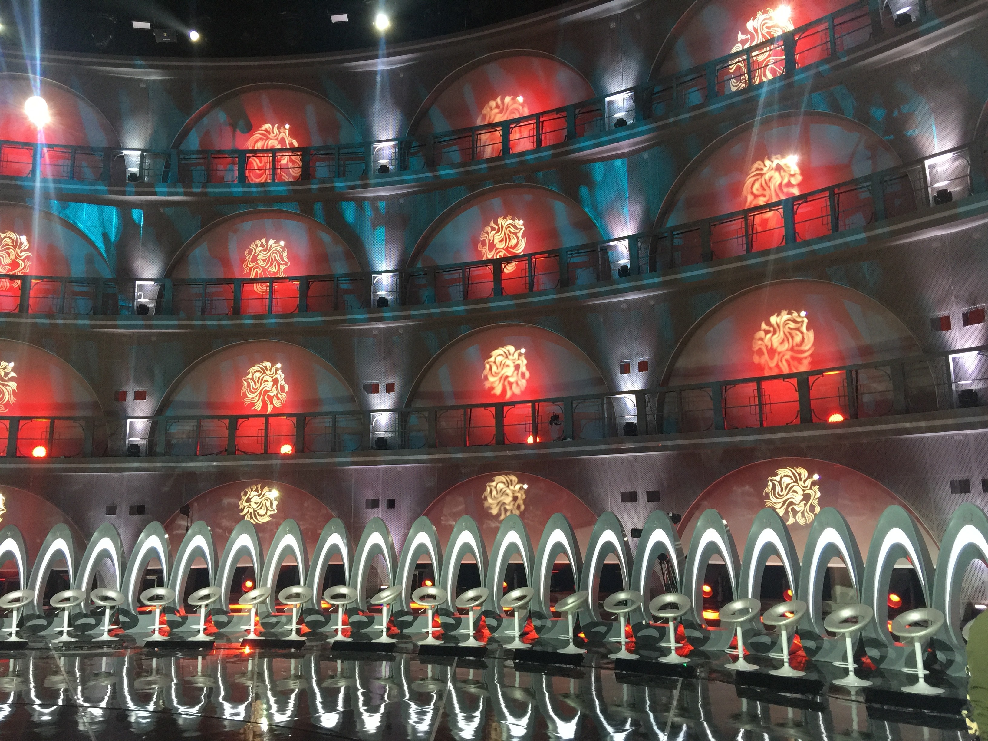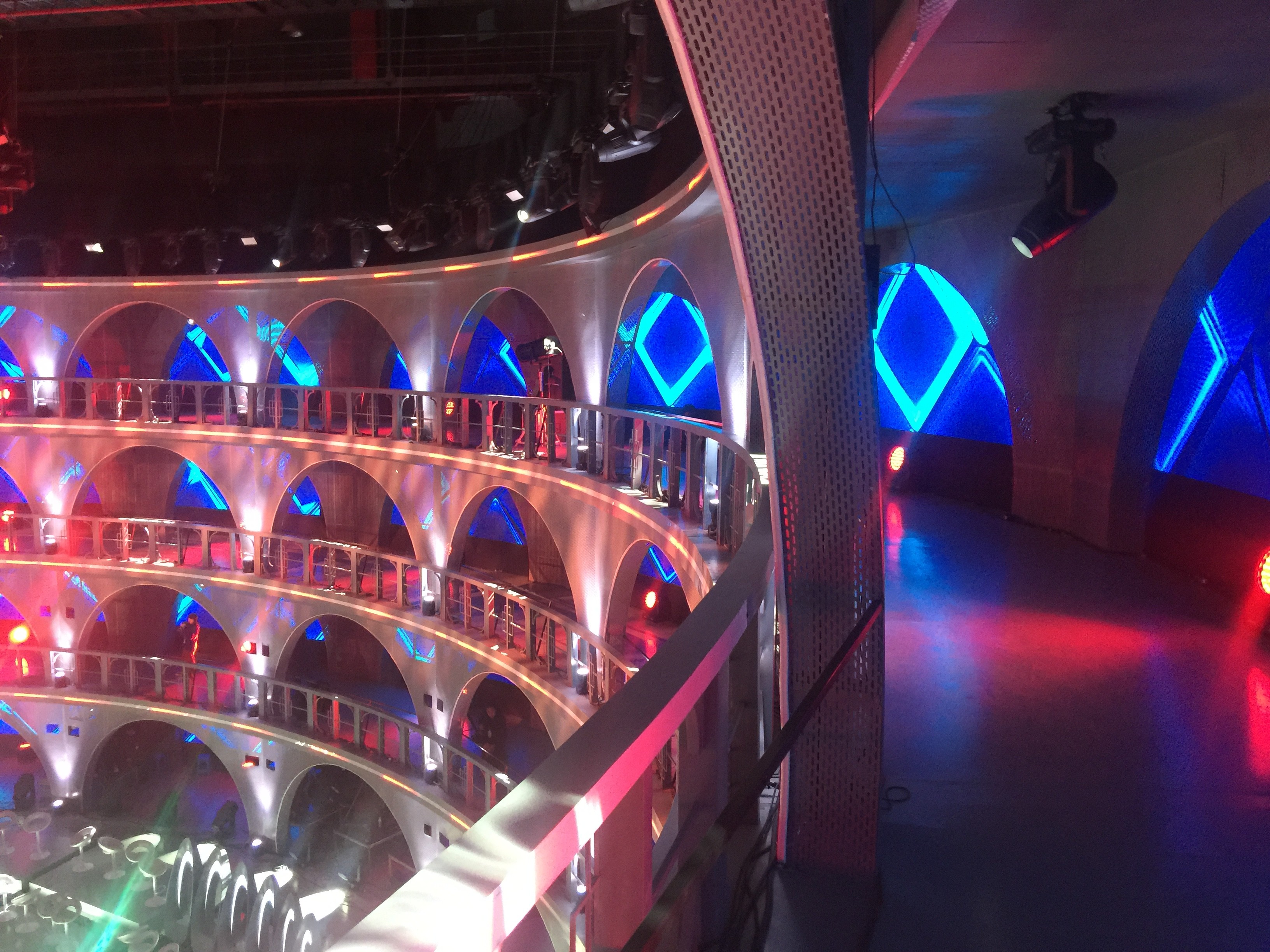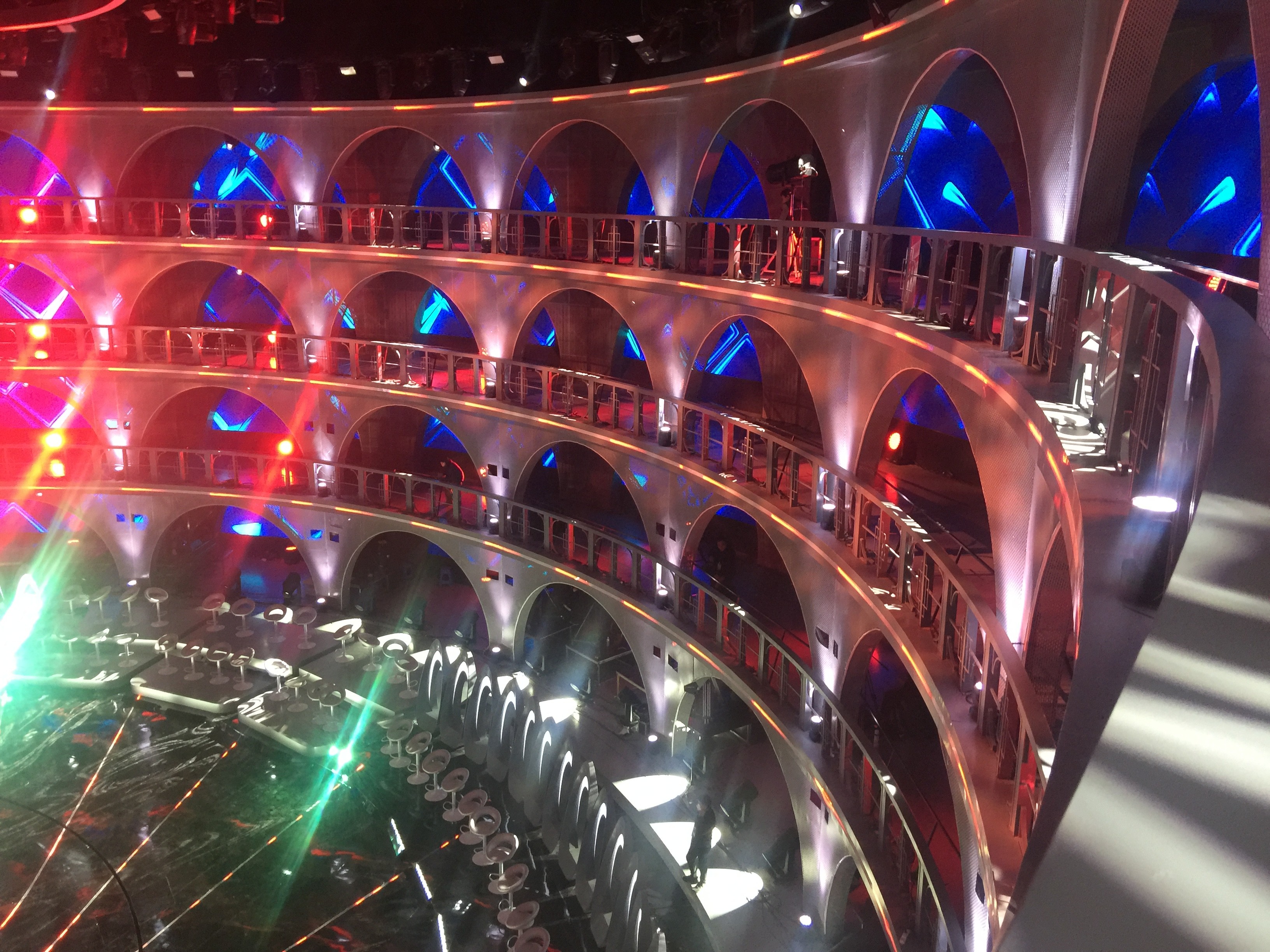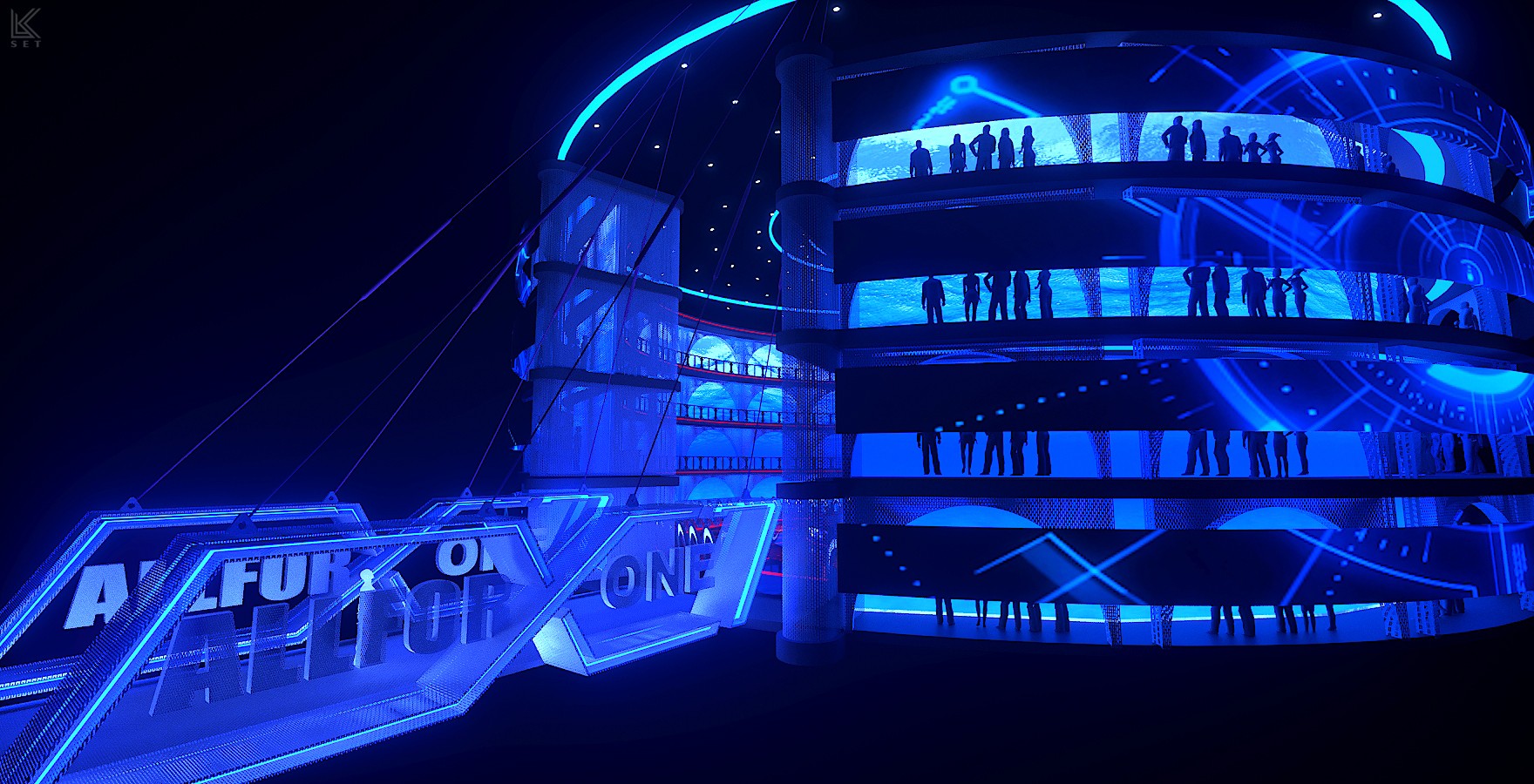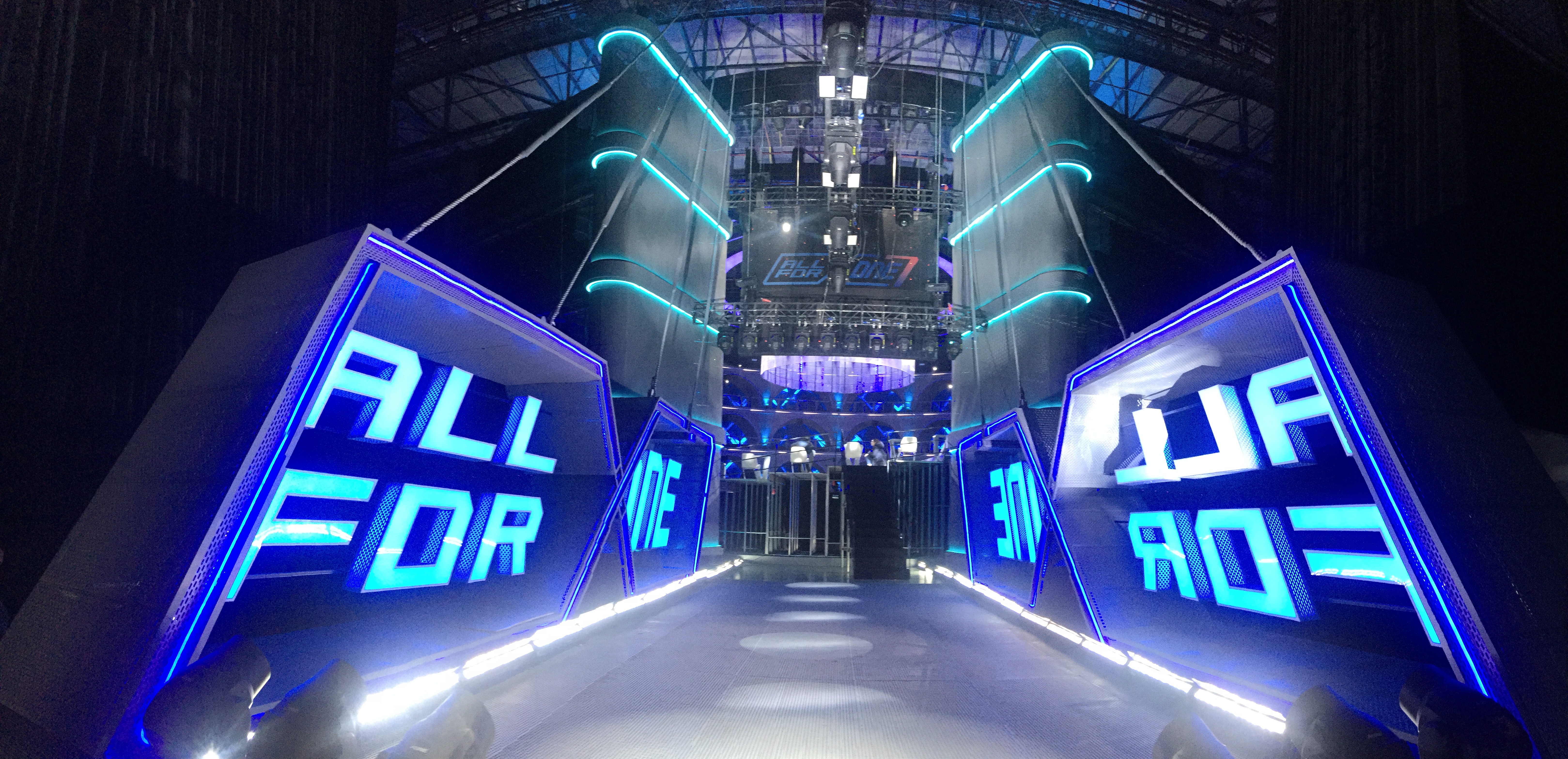 Inspired by a modern coliseum, this stage blends geometric structure with light and motion to create a powerful space for group competition.