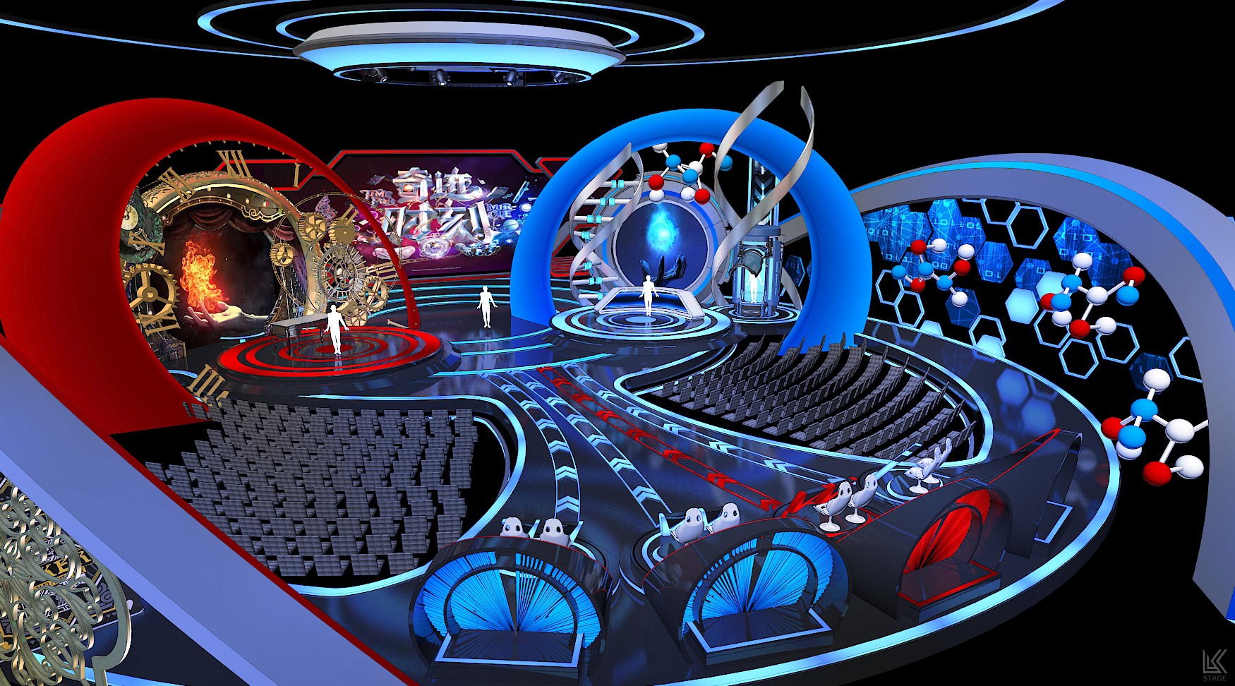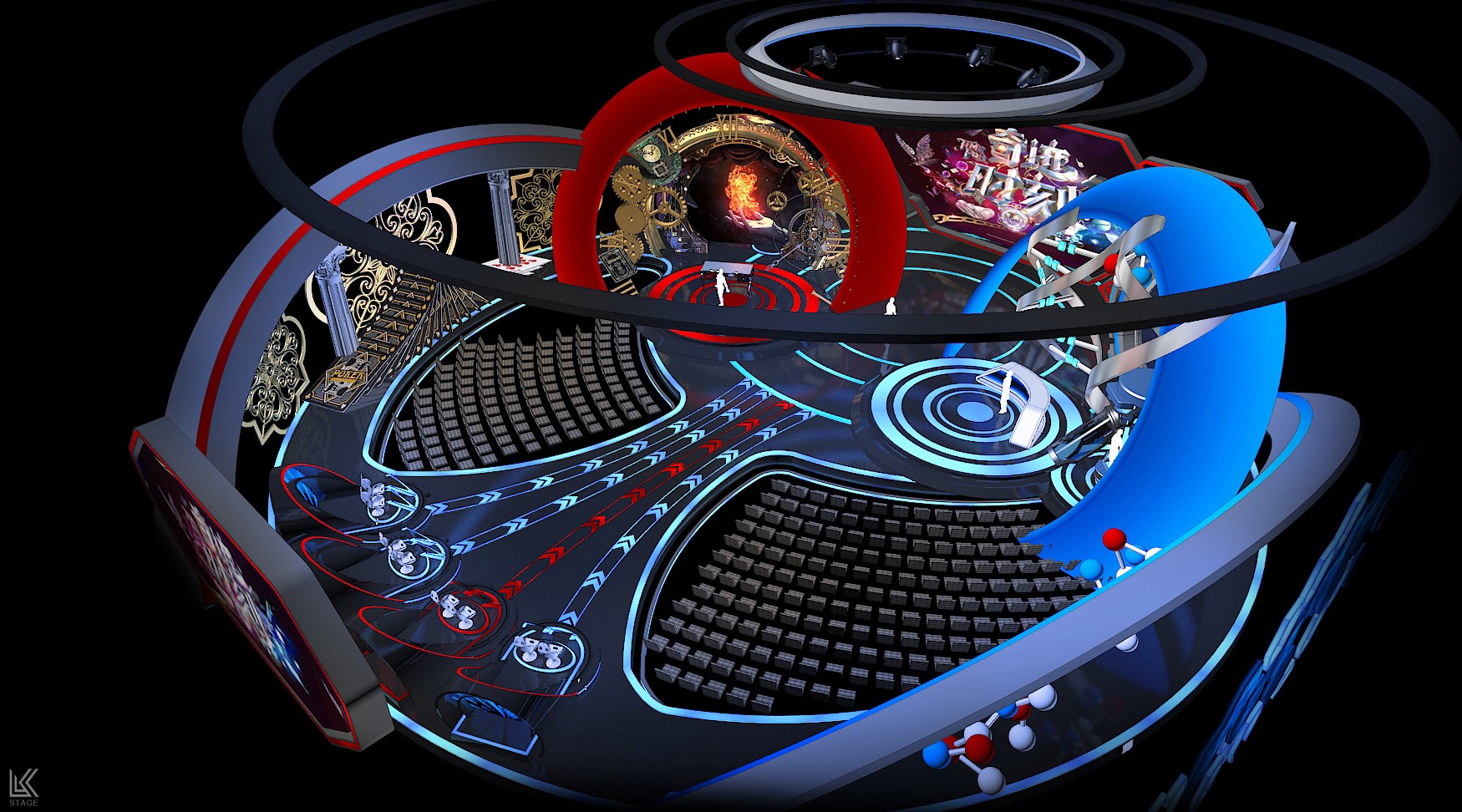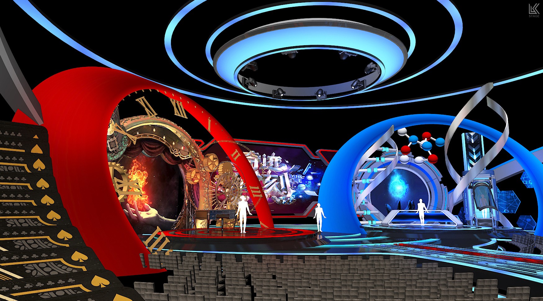 'Miracle Moment' is unique in its mission to reveal the science behind "magic." My core design was to manifest this duality in the physical space. I designed the main stage as two symmetrical sections, shaped like a giant pair of 'observing eyes': the 'Eye of Magic' on the left was dedicated to presenting incredible phenomena, full of mystery and theatrical tension; meanwhile, the 'Eye of Science' on the right was a calm, rigorous laboratory space for deconstructing and verifying the scientific principles behind the miracles. While independent, these two spaces were connected by a central visual axis, creating a dialogue and guiding the audience's gaze back and forth between "sensory wonder" and "rational inquiry." This design turned the stage itself into a narrative tool, not only showcasing miracles but also leading the audience to appreciate the intricate beauty of the scientific logic behind them.