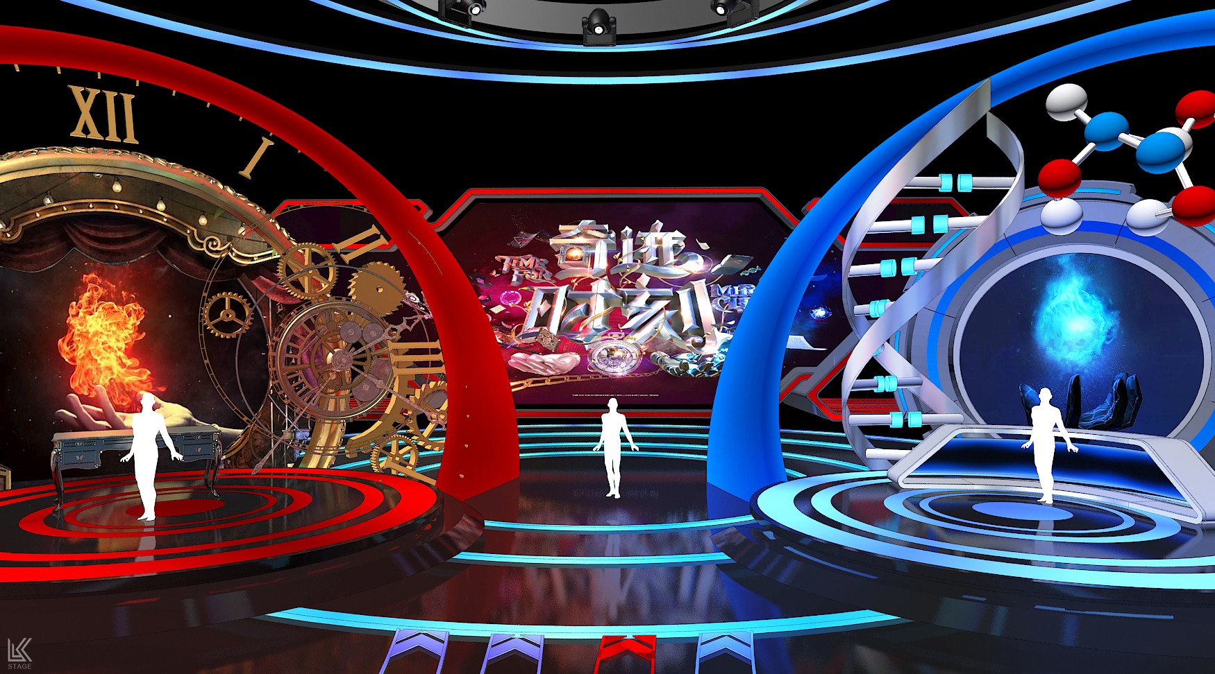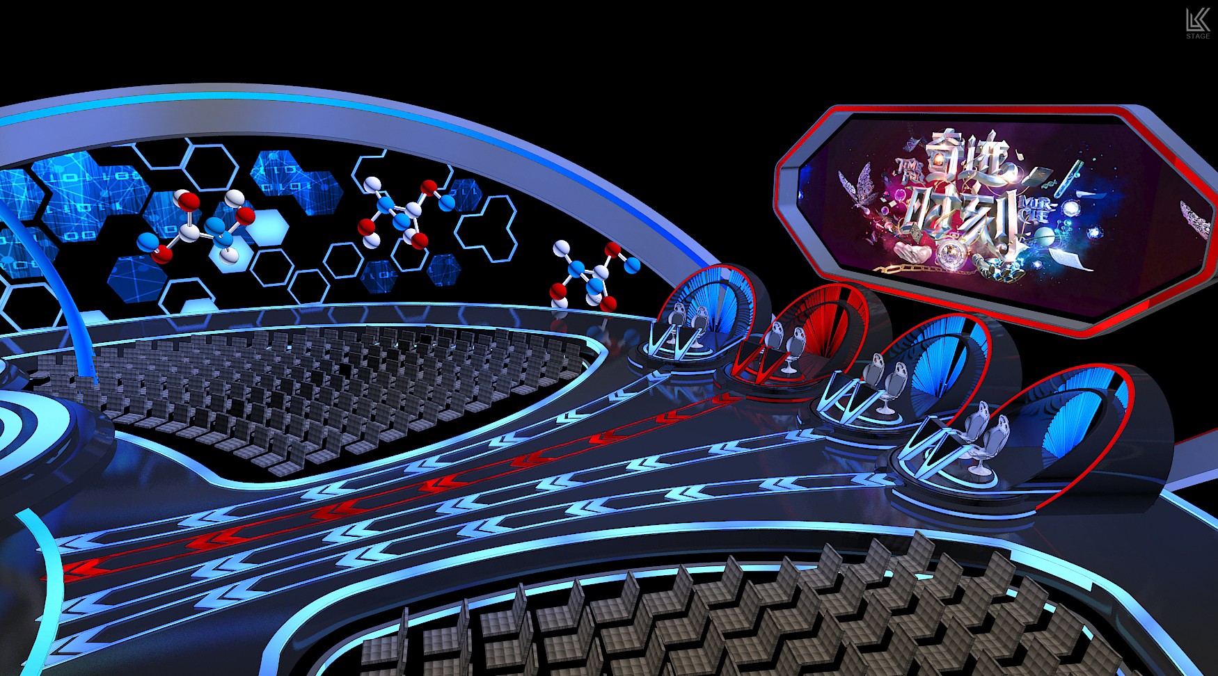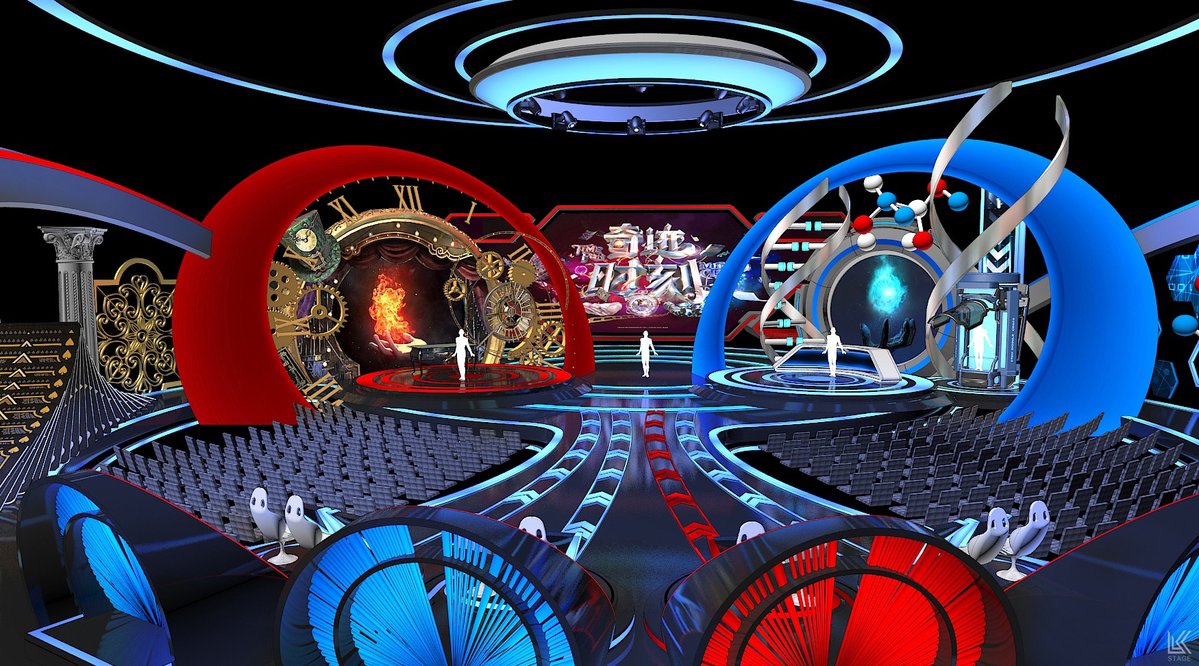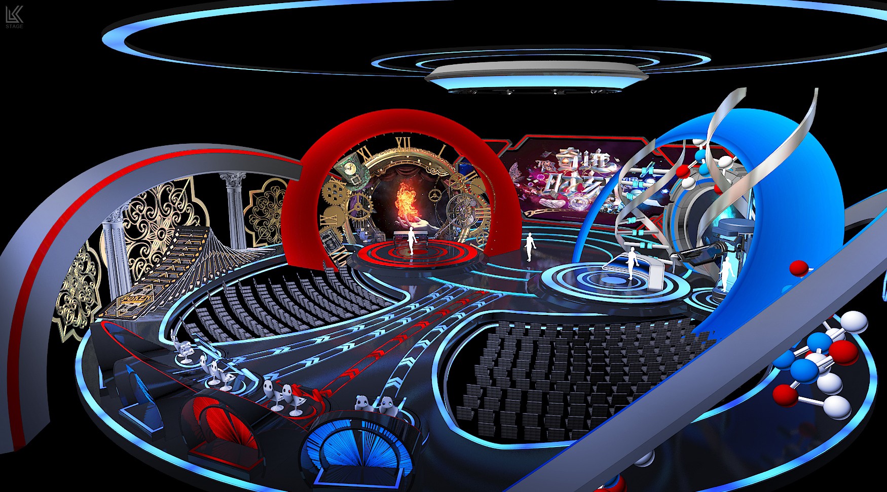 'Miracle Moment' is unique in its mission to reveal the science behind "magic." My core design was to manifest this duality in the physical space. I designed the main stage as two symmetrical sections, shaped like a giant pair of 'observing eyes': the 'Eye of Magic' on the left was dedicated to presenting incredible phenomena, full of mystery and theatrical tension; meanwhile, the 'Eye of Science' on the right was a calm, rigorous laboratory space for deconstructing and verifying the scientific principles behind the miracles. While independent, these two spaces were connected by a central visual axis, creating a dialogue and guiding the audience's gaze back and forth between "sensory wonder" and "rational inquiry." This design turned the stage itself into a narrative tool, not only showcasing miracles but also leading the audience to appreciate the intricate beauty of the scientific logic behind them.