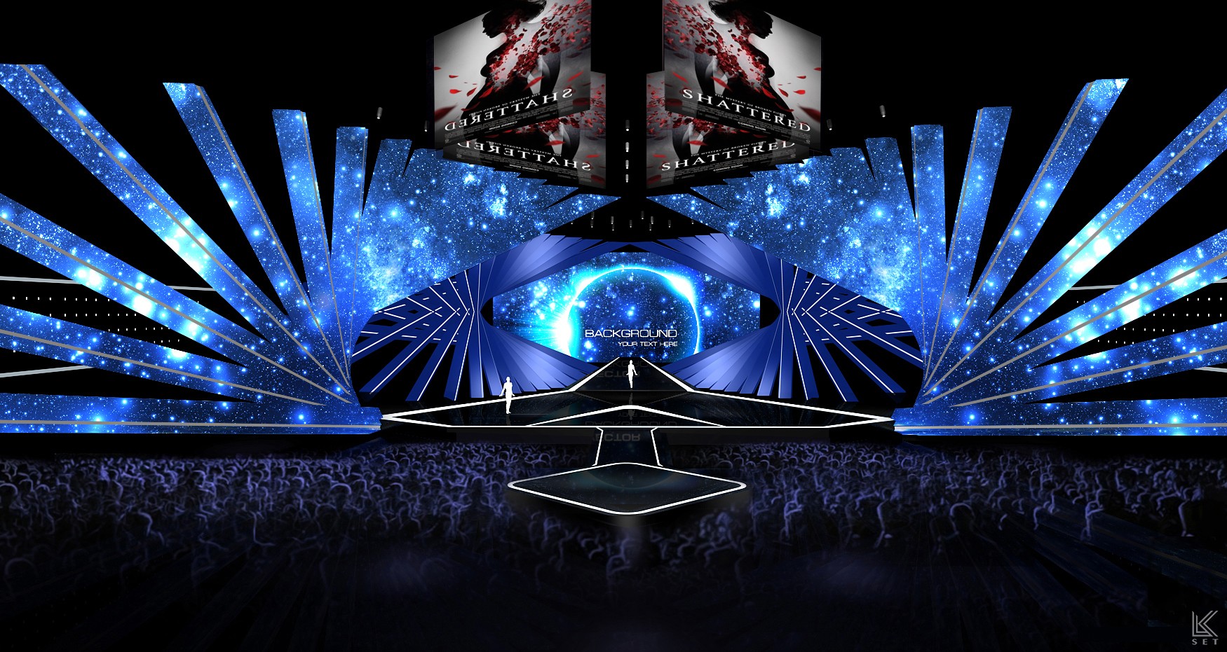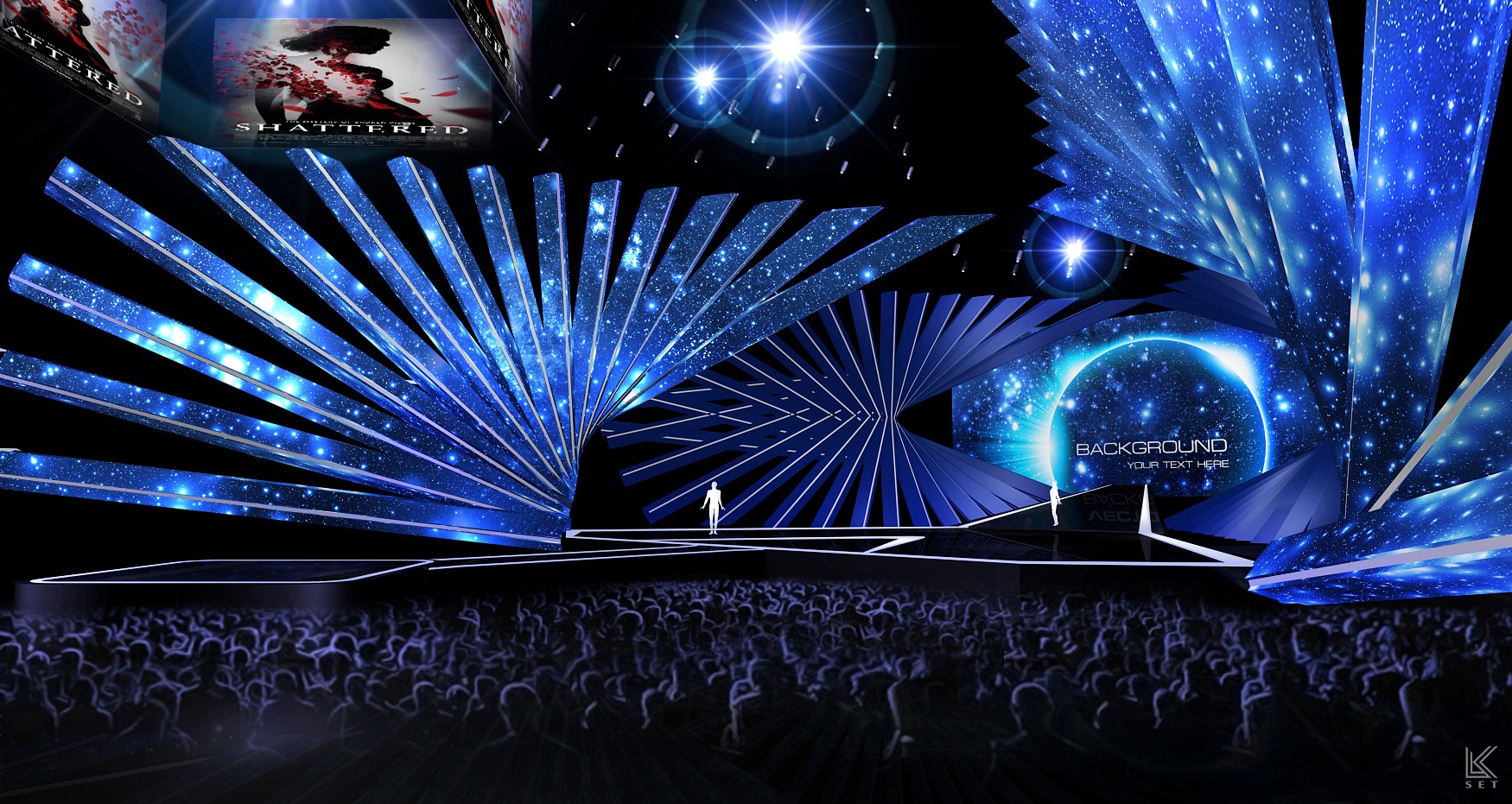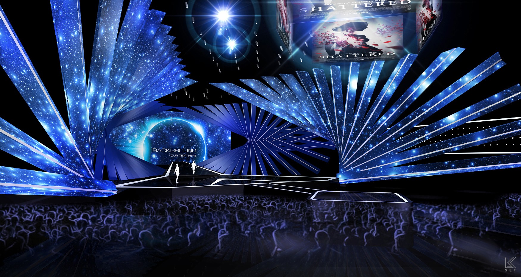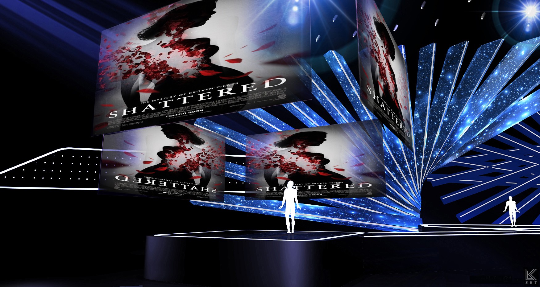 Inspired by the "frame" and "timeline" of digital film, the design abandons the concept of a traditional screen in favor of an architectural, linear composition. The entire space is composed of multi-layered, staggered LED video strips. This structure breaks the constraints of a single screen, allowing visual content to flow freely in a fragmented, multi-threaded manner. The audience is completely enveloped by the light and imagery of this multi-layered space.